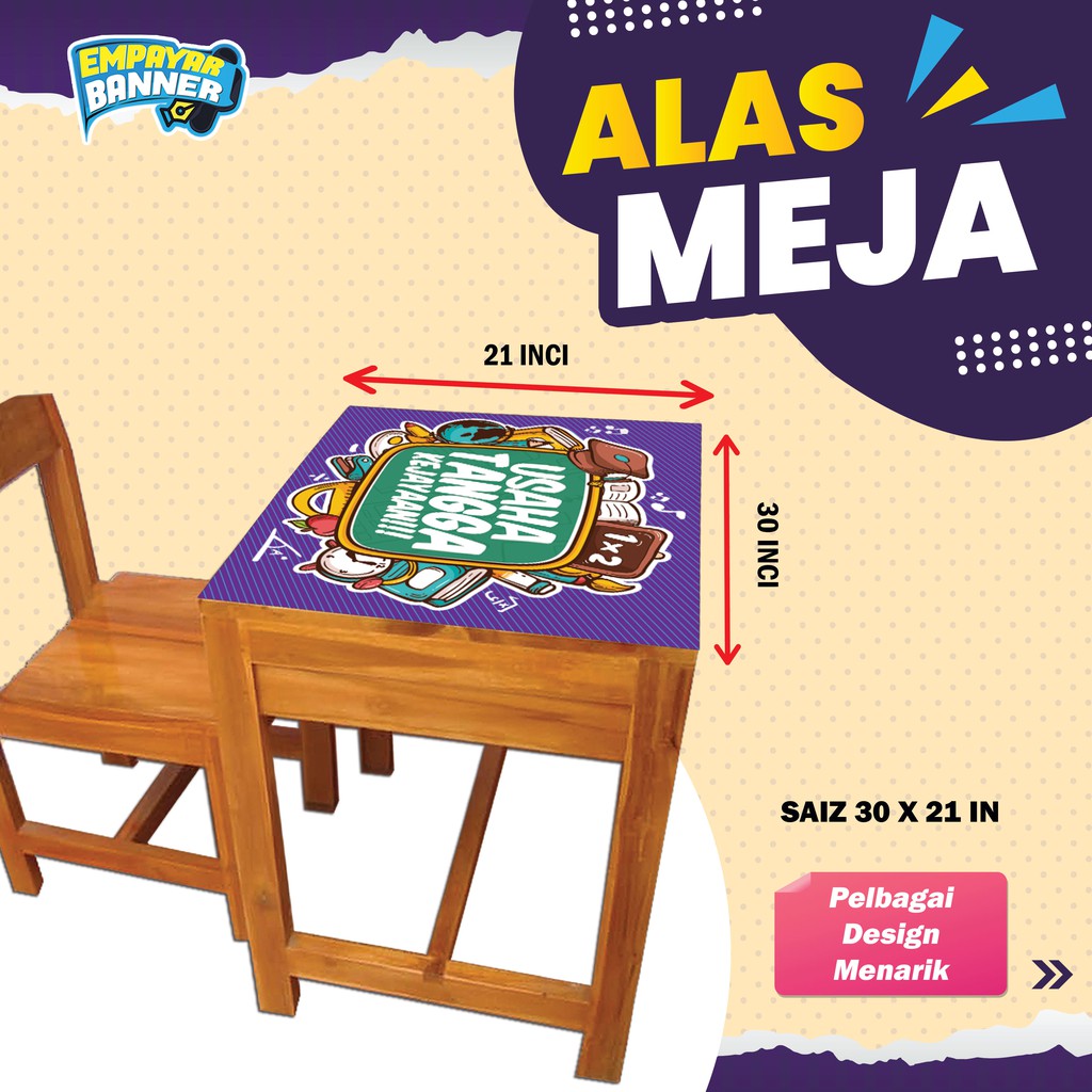 20 DESIGN Alas Meja Sekolah untuk dipilih Printing size 30x21 inci 762mm x 533mm Material PVC Banner 300 320gsm Resolution 720dpi Finishing Cut to Size Product Weight pcs 100gm Spesifikasi Standard permukaan meja sekolah 700mm x500mm Cara pemasangan Balut dan stapler gun ataupun double sided tape di bawah permukaan meja plastik alas meja. Ada Pelbagai design corak menarik. 100pcs alas meja bersulamkan logo sekolah.