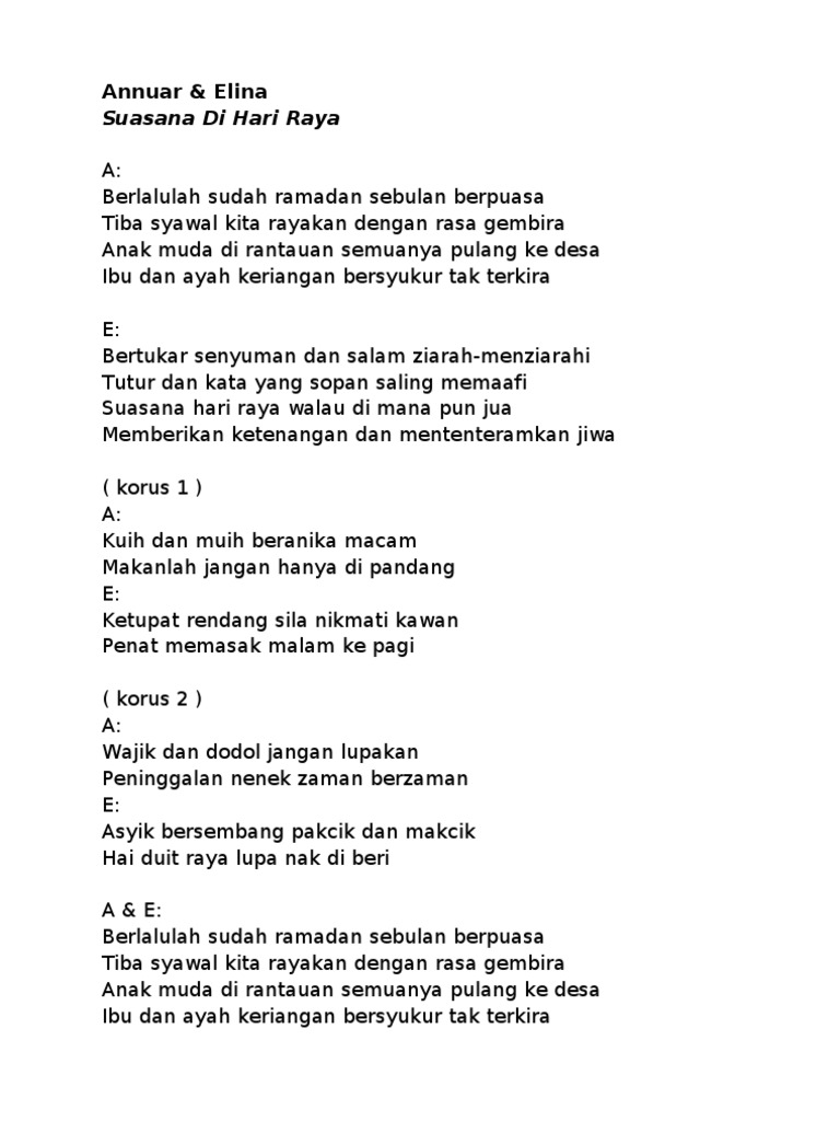 Intro C D G Em7 C D G G7 C D G Em7 C D G Verse 1 C D G Em7 Berlalulah sudah Ramadan sebulan berpuasa C D G G7 Tiba Syawal kita rayakan dengan rasa gembira. Lagu raya Suasana Hari Raya by Anuar Zain Elina. Kuih dan muih beranika macam Makanlah jangan hanya di pandang E.